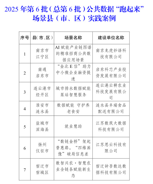 原题:7个案例入选2025年第6批江苏公共数据“跑起来”名单江苏省数据局近日确定7个场景纳入2025年第6批(总第6批)公共数据“跑起来”县(市、区)实践案例。