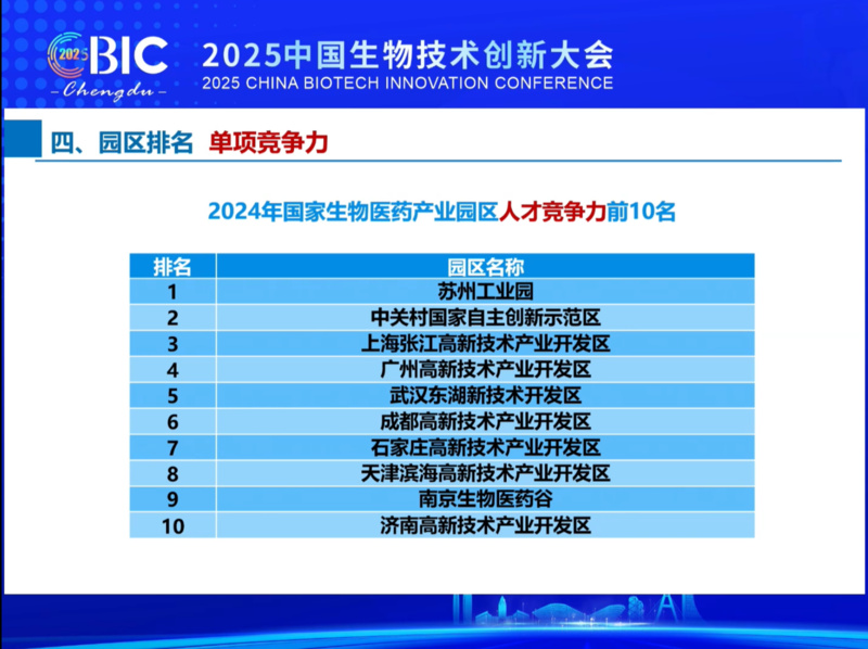 在人才竞争力单项排名中,苏州工业园区、南京生物医药谷分别列第1名、第9名。