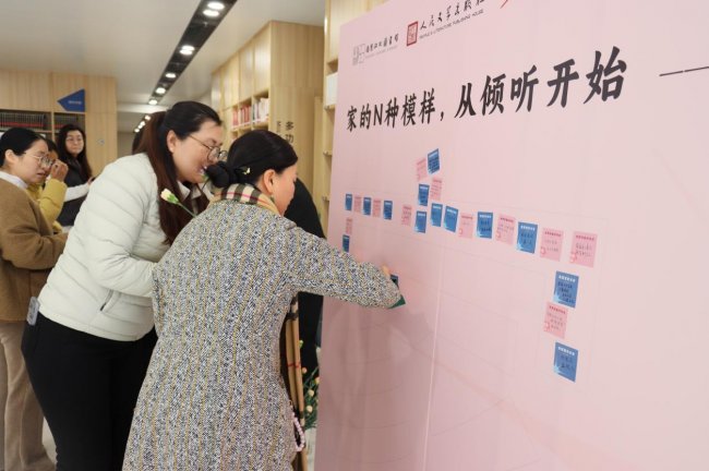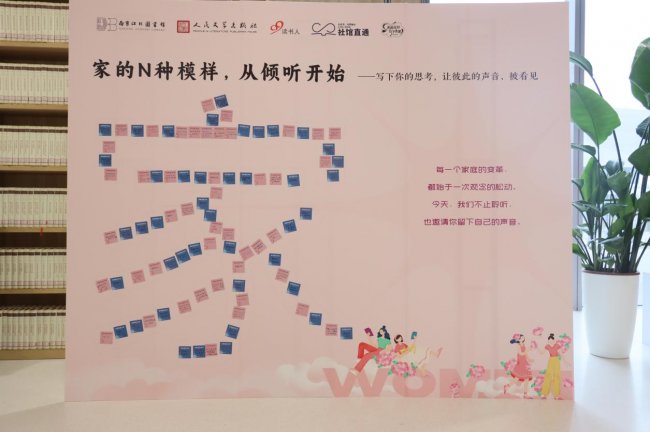 活动现场,既有思想的深度交锋,更有暖心的温情互动。签到台前,一枝枝赠出的康乃馨散发出淡淡花香,为这场春日对话添上温柔底色;图书馆特设的“家的N种模样”互动墙前,读者们执笔抒怀,用红色便利贴写下想要突破的传统桎梏,以蓝色便利贴描绘心中期许的未来图景,一张张便签层层拼贴,勾勒出“家”的轮廓,也凝聚起大家对美好家庭形态的共同想象。