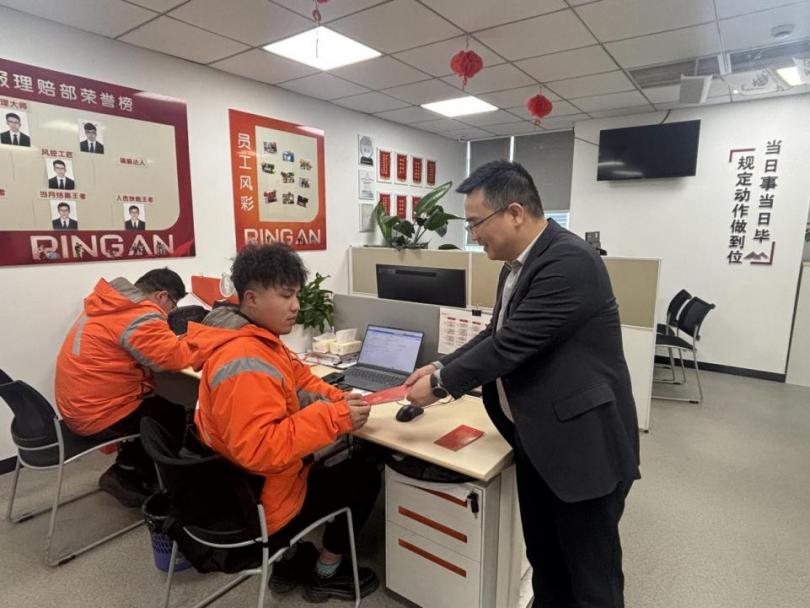 浙江分公司副总经理刘刚前往理赔作业一线,慰问春节值班坚守岗位的员工,亲手送上新春礼包,叮嘱一线员工注重安全、劳逸结合,同时倾听理赔一线声音,收集问题建议,作为提升理赔管理水平的宝贵经验。
