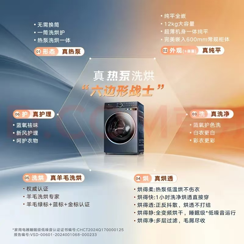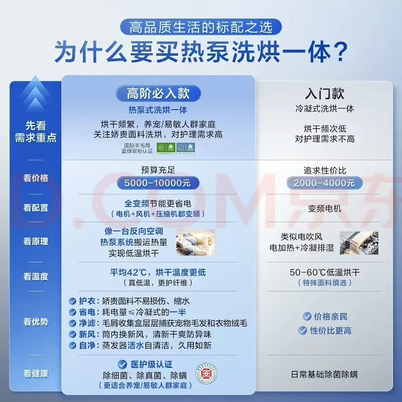2. 热泵烘干技术,低温节能护衣该机型采用热泵烘干结合全变频系统,实现低温(60℃以下)稳定烘干,烘干更快更透且衣物更柔软。热泵利用逆卡诺循环回收热量,节能率较传统冷凝式烘干高出约50%,同时控温精度高,减少面料损伤,满足羊毛、丝绸等高端面料的使用需求。