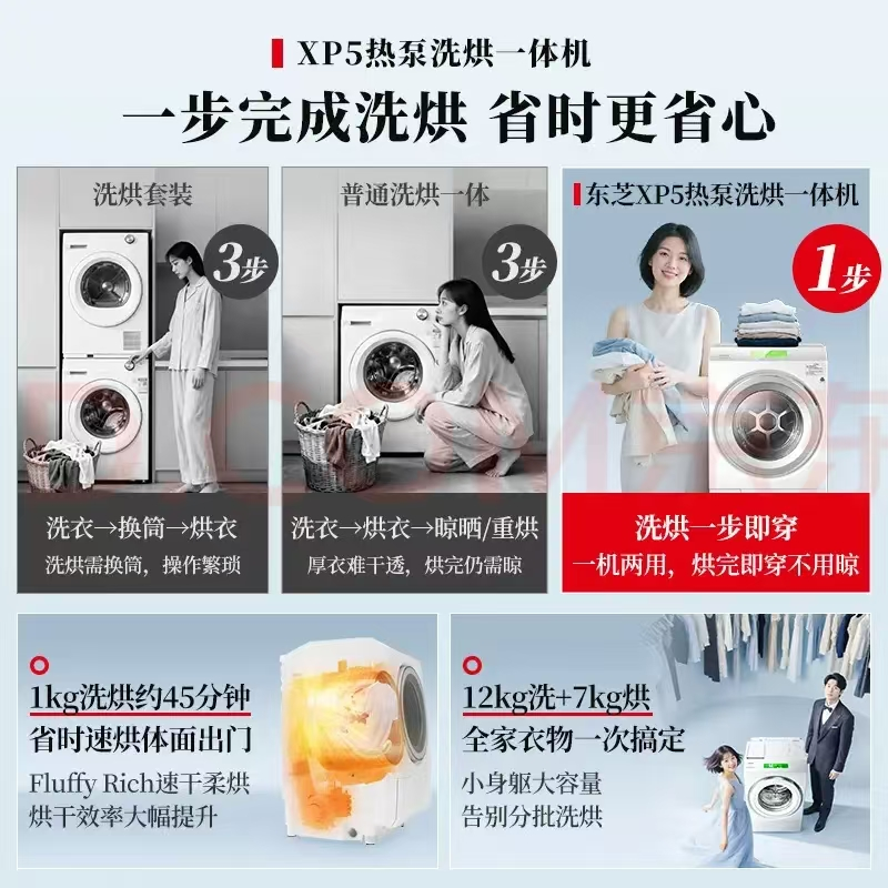 具体产品介绍:东芝XP5搭载UFB双微泡Plus技术,增强洗涤剂活性和深层污渍剥离,洗净比达到1.28,冷水洗净效果媲美热水。其全变频热泵烘干系统配合双通道热交换器,提升烘干效率30%,智能正反转减少褶皱,烘干速度快且衣物蓬松。六维除毛屑系统覆盖多部件自动清洁,宠物毛发去除率高达99.7%。星级护理程序精准适配多种面料,除菌除螨效果显著。