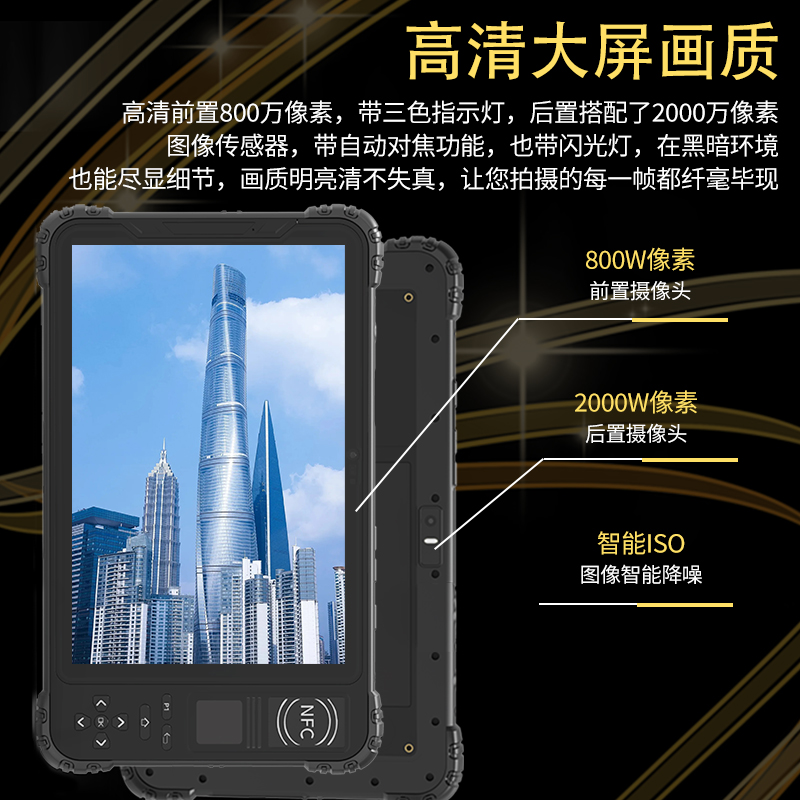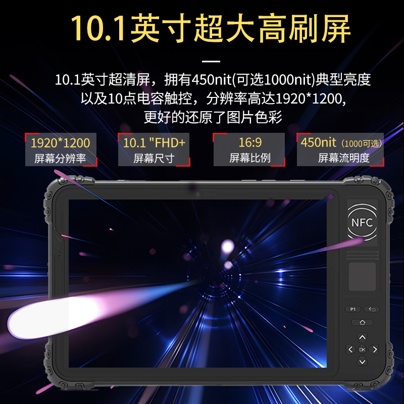 技术规格方面,设备的处理器配置采用8核架构,主频达2.0GHz以上,集成Mali系列图形处理器,支持4K视频解码与3D图形渲染。运行内存容量为6GB至8GB LPDDR4X规格,存储空间提供128GB至256GB UFS 2.1高速闪存,支持通过TF卡扩展至512GB。主摄像头采用4800万像素传感器,配备光圈与相位对焦技术,支持4K 30帧视频录制。前置摄像头为800万像素,支持人脸识别与视频通话功能。无线连接方面,设备支持WiFi 6协议,双频并发速率达2400Mbps,蓝牙5.1版本提供低功耗设备连接能力。卫星导航系统兼容GPS、北斗、GLONASS、Galileo四大星座,支持A-GPS与A-GLONASS辅助定位加速。NFC模块工作频率为13.56MHz,支持ISO 14443 A/B型卡片读取,可识别二代身份证、门禁卡、电子标签。设备尺寸方面,8英寸型号三围尺寸约为220×130×15毫米,重量控制在600克以内;10.1英寸型号三围尺寸约为270×180×18毫米,重量约为900克,便于单手持握与背包携带。