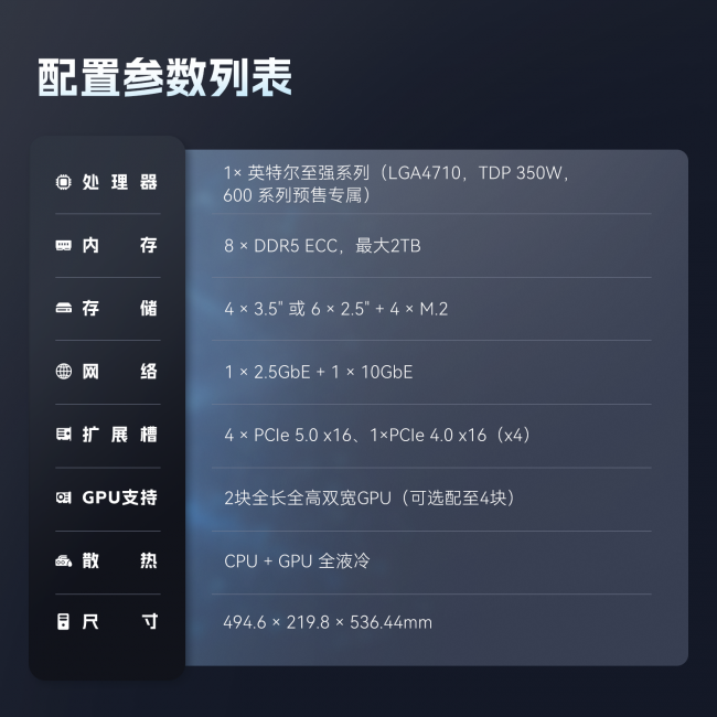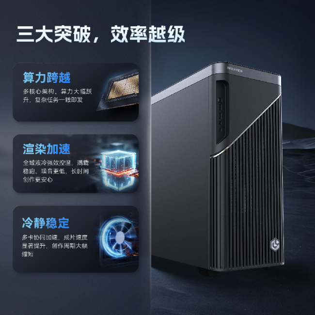 • 算力跨越:多核心架构实现算力大幅跃升,复杂任务一触即发,AI大模型推理、深度学习等高强度计算效率显著提升; • 渲染加速:全域液冷强效控温,满载稳定运行,4K/8K影视渲染、游戏VFX等创作任务时长大幅缩短,长时间创作更安心; • 冷静稳定:多卡协同加速,成片速度显著提升,创作周期大幅缩短,同时实现≤42dB静音运行,兼顾高性能与舒适办公体验。