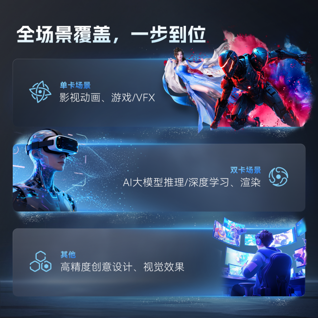• 单卡场景:影视动画、游戏/VFX创作,为内容创作者提供高效渲染算力,出片效率提升50%-80%; • 双卡场景:AI大模型推理/深度学习、专业渲染,兼顾AI开发与内容创作双重需求; • 其他场景:高精度创意设计、视觉效果制作,适配工业设计、建筑可视化等多元专业场景。