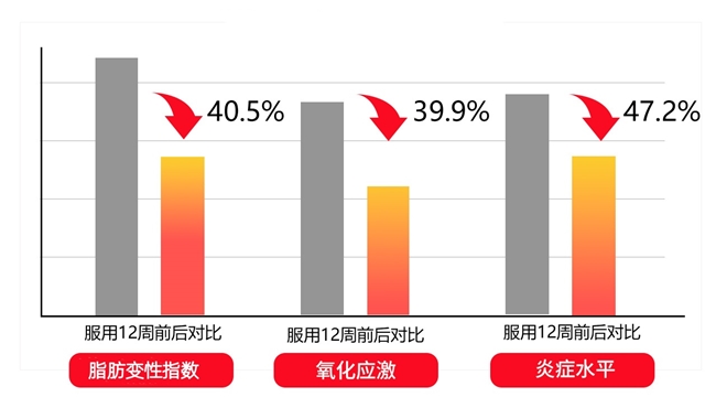 关键指标改善:ALT平均降幅37%,甘油三酯降幅16.2%,游离脂肪酸净改善17.8%;脂肪变性指数下降40.5%,氧化应激降低39.9%,炎症水平下降47.2%。主观感受层面,乏力感消失率100%,眼黄减轻32%,口腔异味下降26%。以上变化在第3周即有显效,第12周指标降幅最为亮眼。