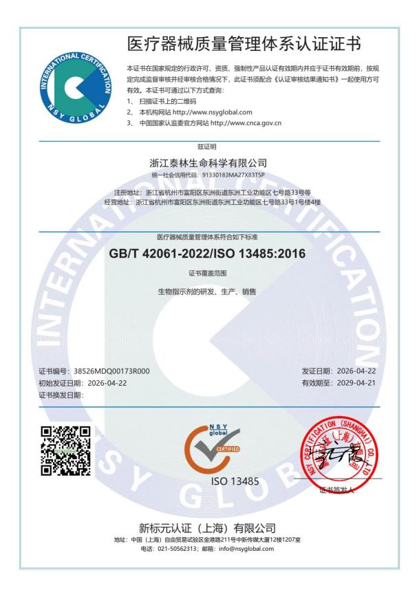 浙江泰林生命科学有限公司获得ISO 13485认证