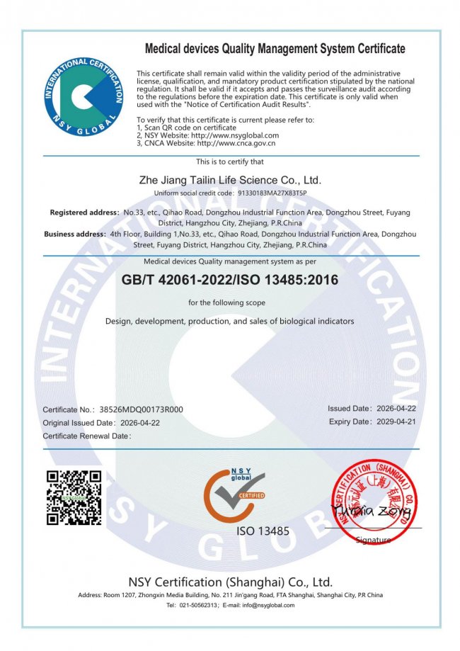 此次认证通过,标志着浙江泰林生命科学有限公司的生物指示剂产品质量迈上新高度:以高稳定性、一致性为核心,构建全流程质量管理体系;全生命周期管理深度落地,实现从原料到成品的全程可追溯。产品性能满足各行业市场准入要求,为制药企业、医疗行业、疾控中心、食品行业等客户提供更可靠、更合规的灭菌效果验证解决方案。泰林进一步强化了“安全有效”的核心理念,将质量管控融入原材料批次检验、生产记录追溯、质量风险防控等每一个细节。