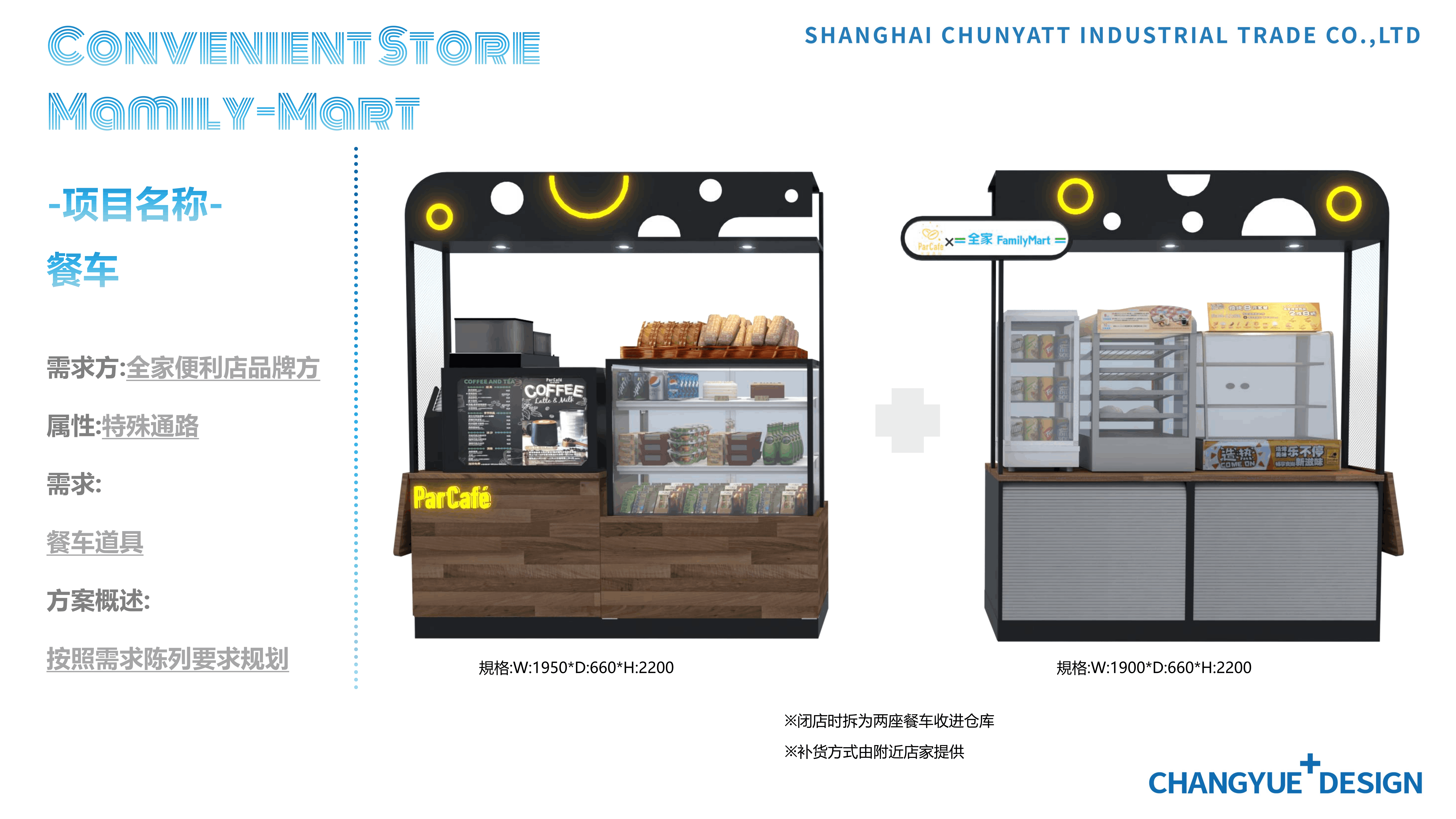 对于办公楼、店中店等特殊通路,咖啡模组化展台/咖啡站提供了极速交付的可能性。这类产品具备快搭快拆属性,适应咖啡设备自助化需求,同时便于运输和空间调整。而移动餐车则满足户外及特定场景的零售需求,典型规格为W:1950D:660H:2200,设计符合标准出口运输规范,支持单独放置于户外或办公区域。