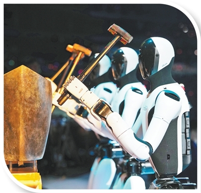智能人形机器人敲击“青铜句鑃”,从海上丝绸之路破浪而来的宝船,跨越时空,承载精神。