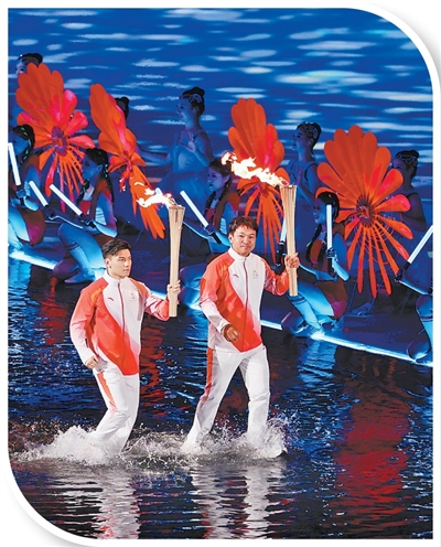 乒乓球奥运冠军马琳和跳水奥运冠军陈若琳高擎第一棒火炬踏浪而来,经过黄金宝、方文浩、郭晶晶、王欣瑜、王柳懿、王芊懿、梁伟铿、赖宣治、冼东妹、容志行的传递,火炬最终交到来自粤港澳三地的运动员苏炳添、张家朗和李祎手中。