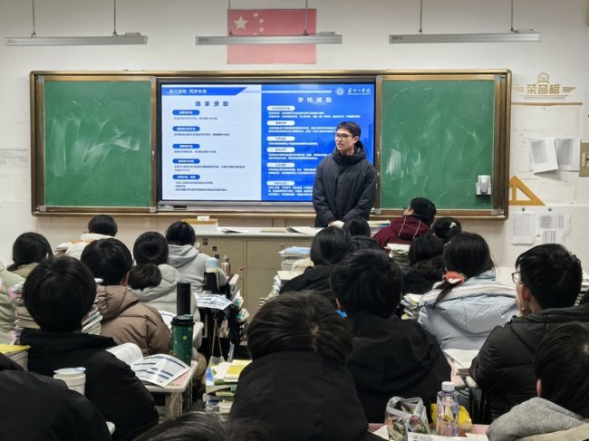 活动当日,由邹艾家带领的团队与校方顺利对接后,迅速进入班级开展宣讲。邹艾家作为主讲人,通过图文并茂的PPT,系统介绍了苏州工学院的整体办学情况,并着重阐述了师范学院在人才培养、师资力量、实践教学以及就业发展等方面的突出优势。她结合师范生的学习体验与成长收获,生动描绘了大学阶段专业学习与综合素质提升的路径,激发了在场学子对未来学业生涯的思考与向往。